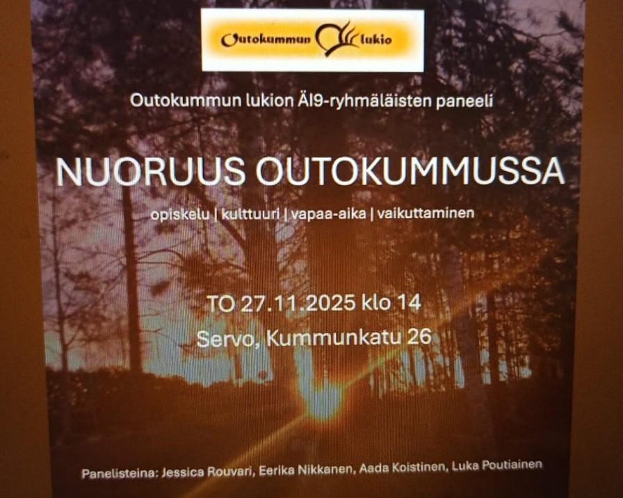 Iltapäivällä 27.11. oli Servolla Outokummun lukion Ä19-ryhmäläisten paneelikeskustelu aiheesta Nuoruus Outokummussa. Panelisteina olivat Jessica Rouvari, Eerika Nikkanen, Aada Koistinen ja Luka Poutiainen.