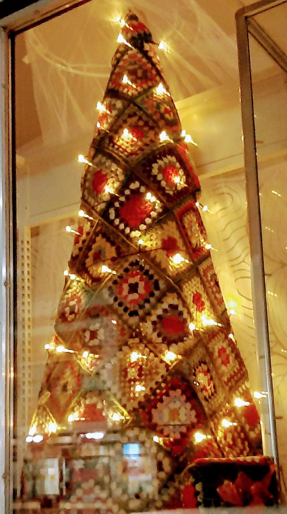 Kotimatkalla kuvasin vielä muitakin kuusia. Outokumpu Martat on somistanut Tilikihan ikkunan kahdella virkatulla kuusella ja muilla ihanilla joulusomisteilla. Outokummun Ympäristön Marttayhdistys on tehnyt virkatun joulukuusen Vanhan postin käsityömyymälän kuistille. Lisätietoa: Vanhan Postin Puoti