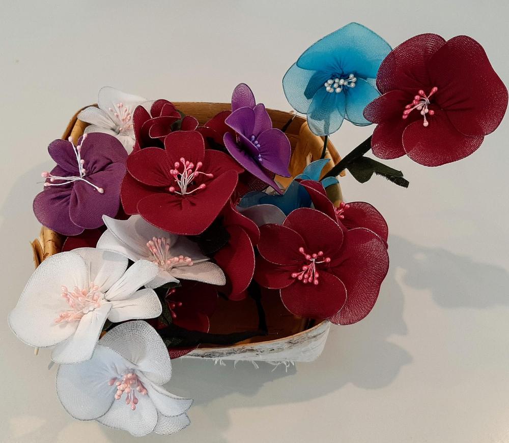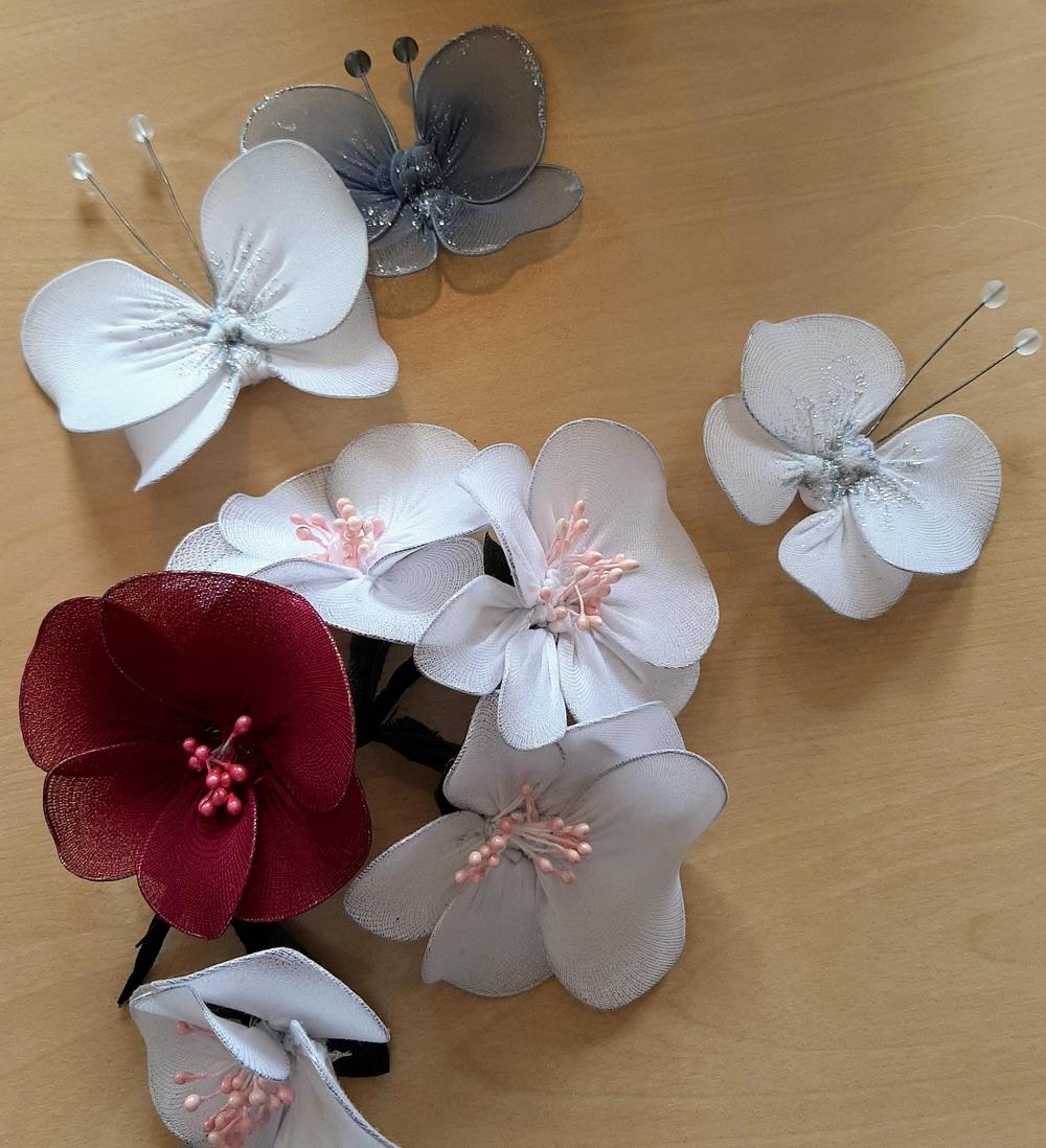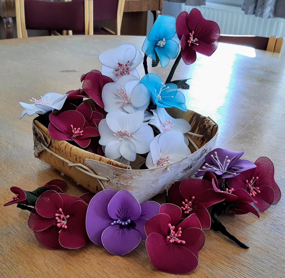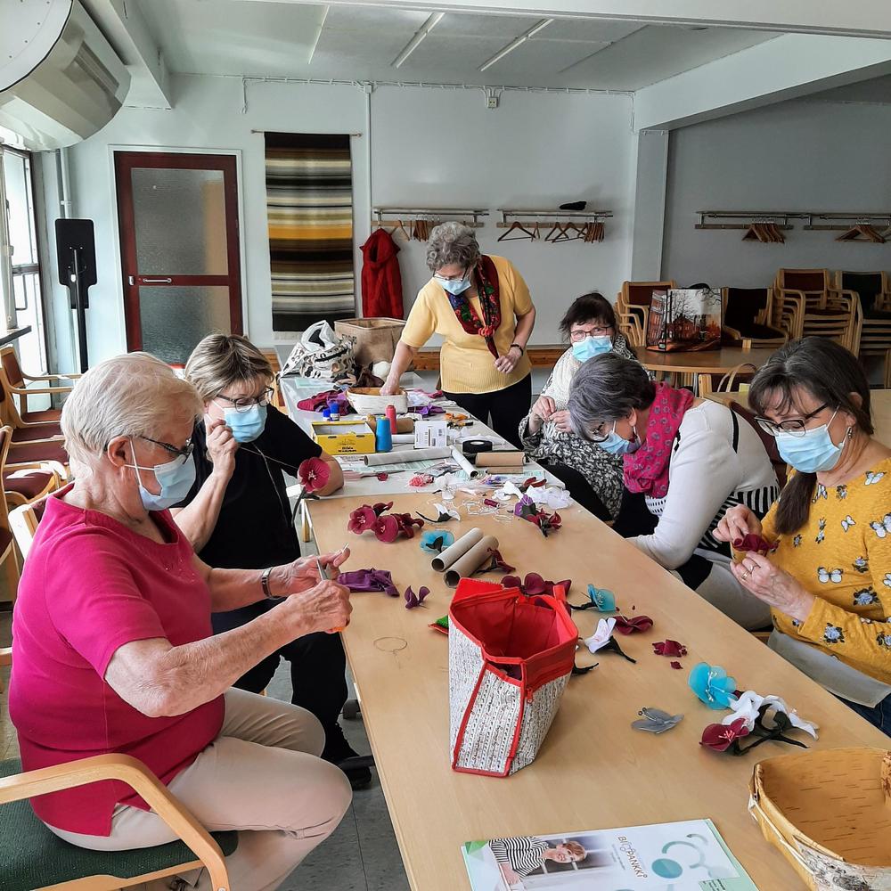 Kymmenkunta naista teki askartelukerhossa Servolla kauniita kukkakoristeita. Kuvissa alapuolella näkyy sekä työvaiheita että valmiita kukkia.