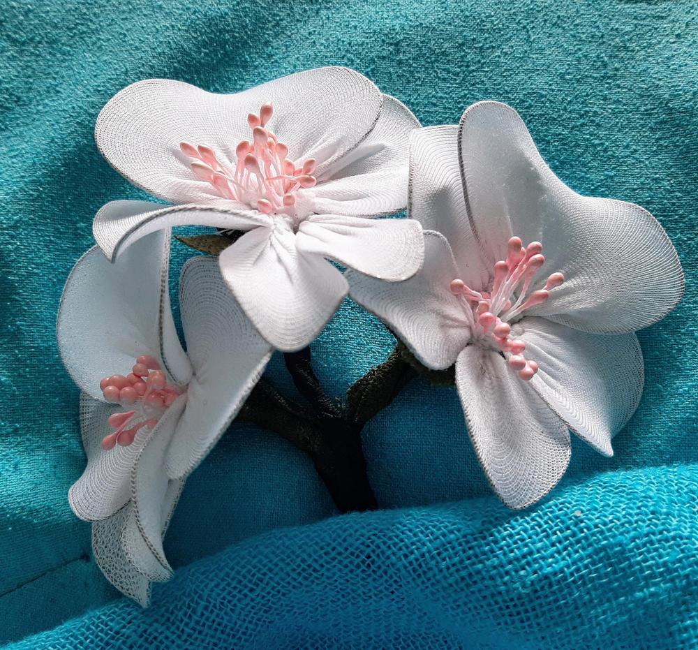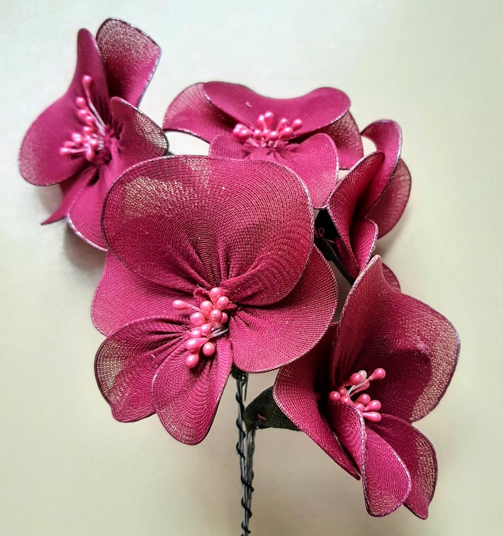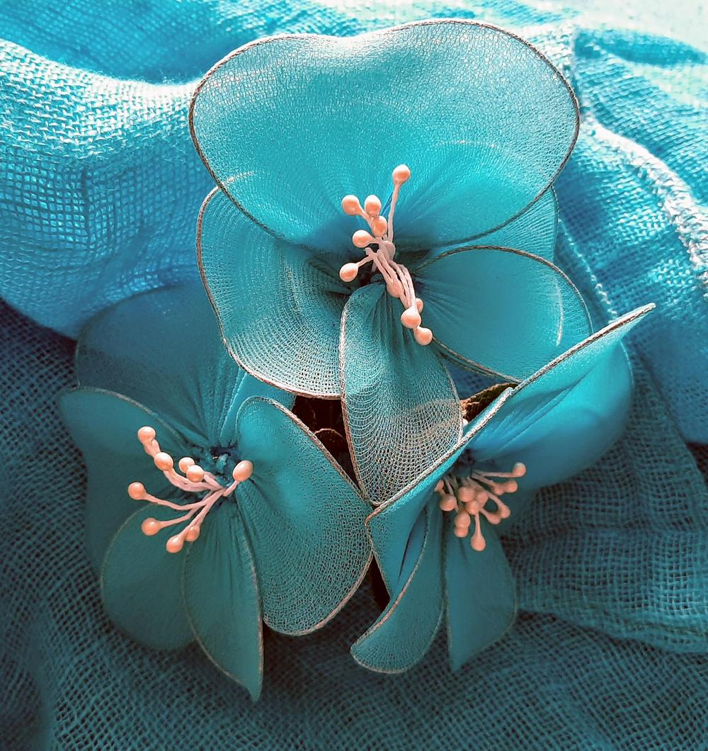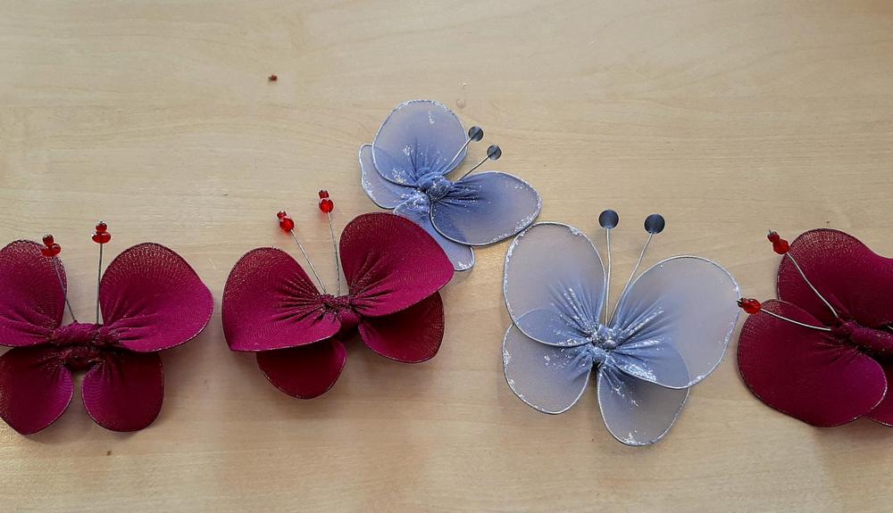 Kymmenkunta naista teki askartelukerhossa Servolla kauniita kukkakoristeita. Kuvissa alapuolella näkyy sekä työvaiheita että valmiita kukkia.