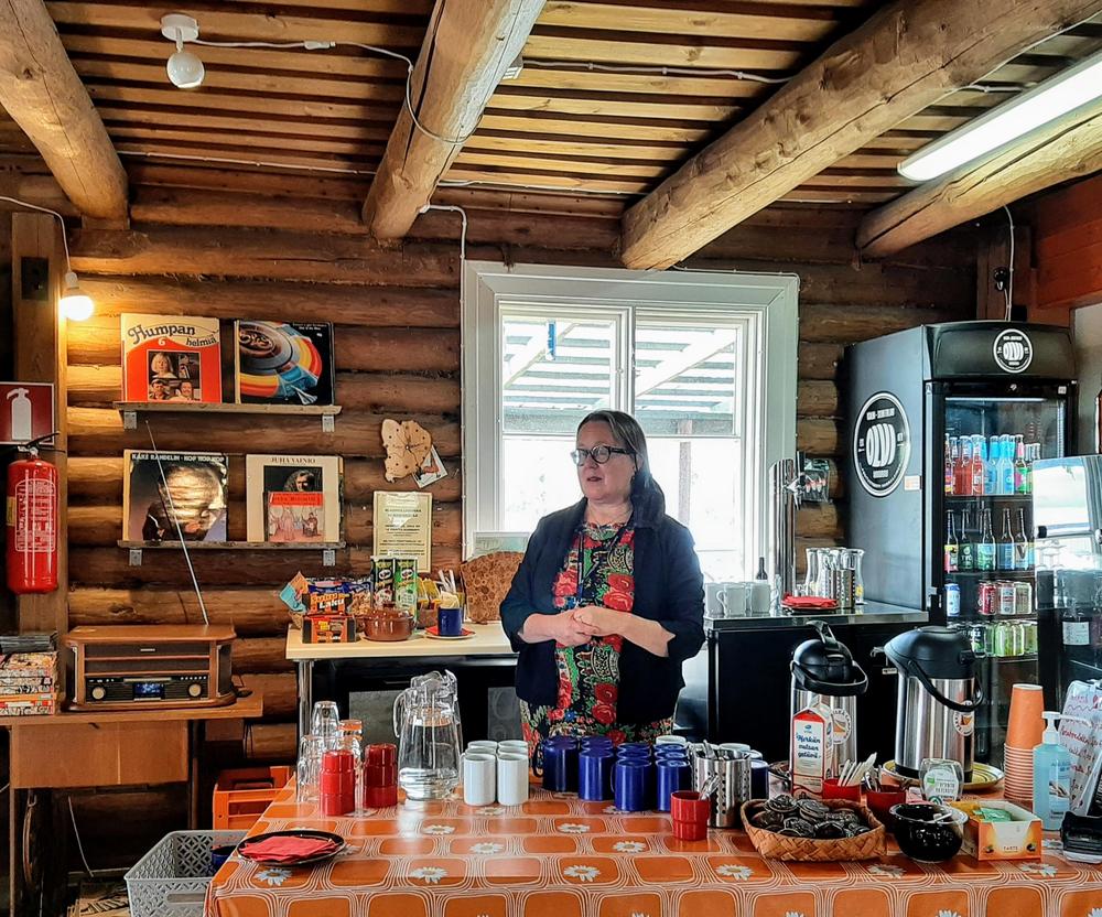Marja Tiittanen kertoi meille kahvilarakennuksen historiasta. Rakennus on kaivosmiesten vanha hiihtomaja ja aikanaan sen on rakennuttanut Outokummun kaivosyhtiö työntekijöiden käyttöön. Työnantaja on halunnut kannustaa kaivostyöntekijöitä liikkumaan raikkaassa ulkoilmassa, että keuhkot puhdistuisivat. Niinpä rakennus ja sen lähiympäristö liittyvät Outokummun kaivoshistoriaan ja tämä paikka oli siksi oivallinen kohde kotiseutukävelylle. Monilla osallistujista oli muistoja tästä rakennuksesta ja sen ympäristöstä ja niitä sai kertoa Marjalle ja / tai muille retken osallistujille.