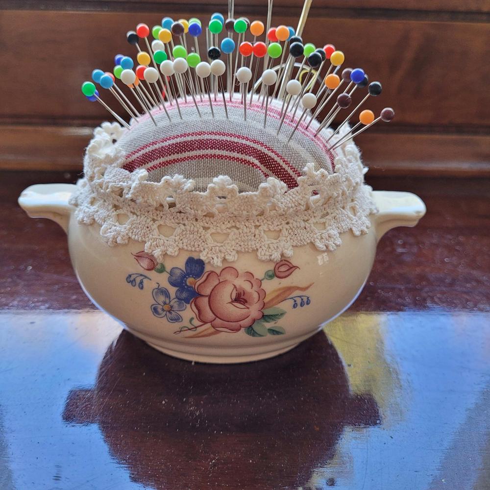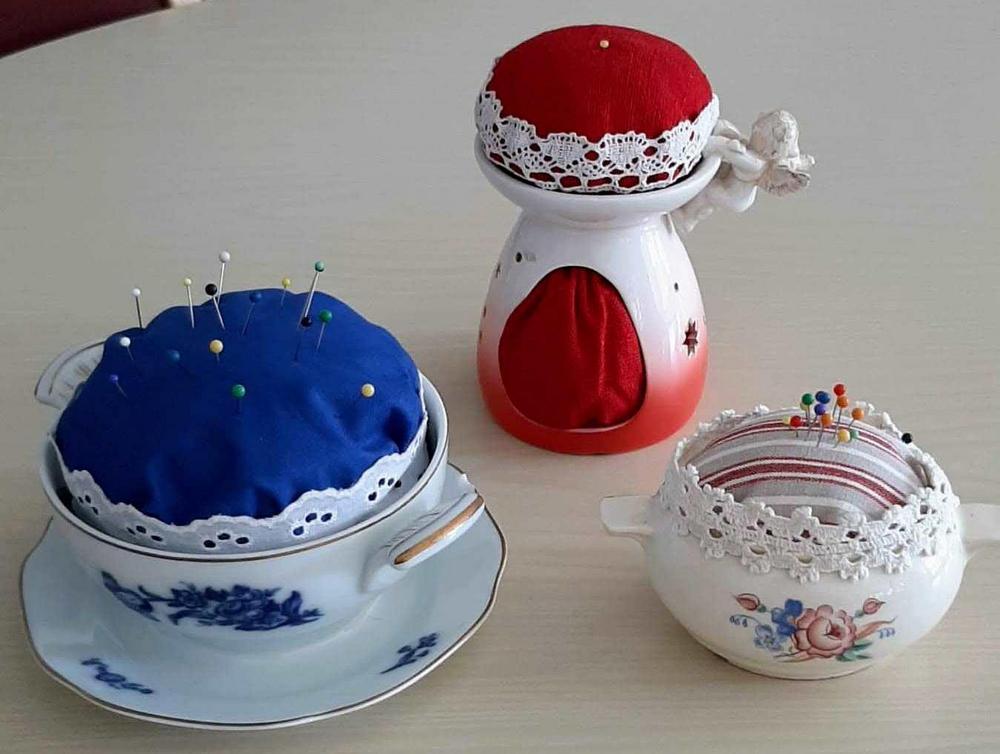 Käsityökerhossa 13.4. tehtiin monenlaista, mm. neulatyynyjä kierrätysastioista.