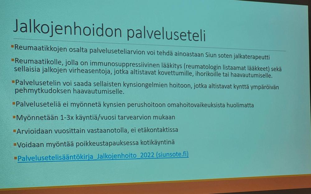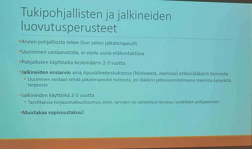 Tänään kerhossa vieraili jalkaterapeutti Eelis Kosonen / Siun Sote. Eelis kertoi esim. jalkojenhoidon palvelusetelistä ja jalkineiden tukipohjallisista. Paljon tuli yleisöltä kysymyksiä ja saimme tietoa siitä millä perusteilla palveluseteleitä myönnetään ja millä perusteilla niitä ei myönnetä ollenkaan. Keskustelimme myös siitä mistä ja millä tavalla esim. tukipohjallisia voi hankkia omalla kustannuksella