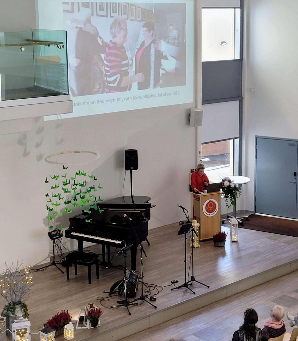 Musiikista vastasivat Janne Vänskä ja Henna Korhonen omalla valloittavalla tyylillään. Saimme myös nauttia Aimon, Joukon ja Paavon laulamana kolmesta laulusta, joita Janne säesti flyygelillä. Kaupungin tervehdyksen juhlaan toi kaupunginjohtaja Päivi Lintumäki ja juhlapuheen piti Reumaliiton toiminnanjohtaja Anu Uhtio. Juhlan juontajana toimi Merja Vähäkoski lämpimällä ja humoristisella tyylillä, varmistaen sen, että juhlasta ei tullut pönötysjuhlaa. Ja juuri näin oli tarkoituskin.