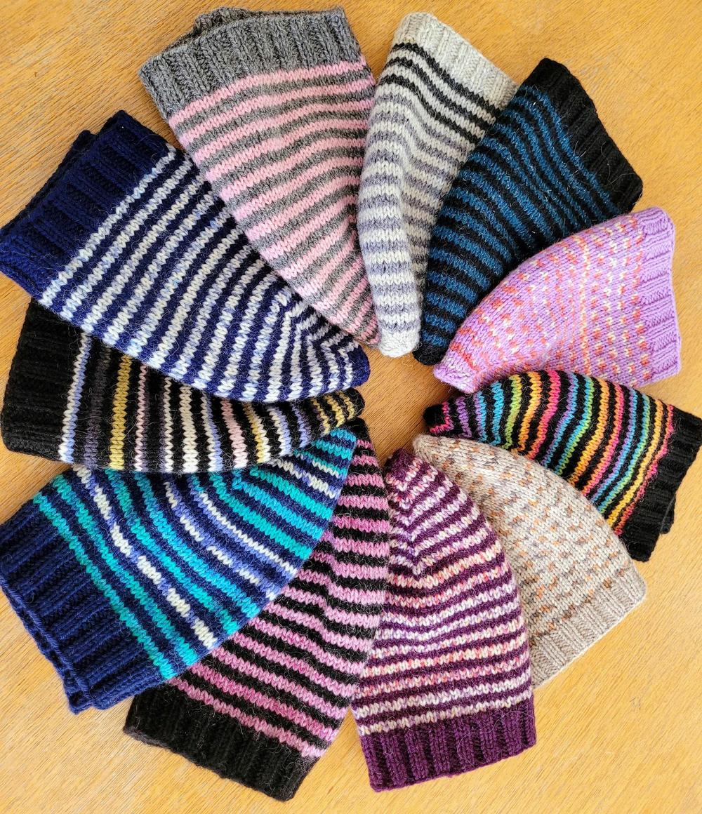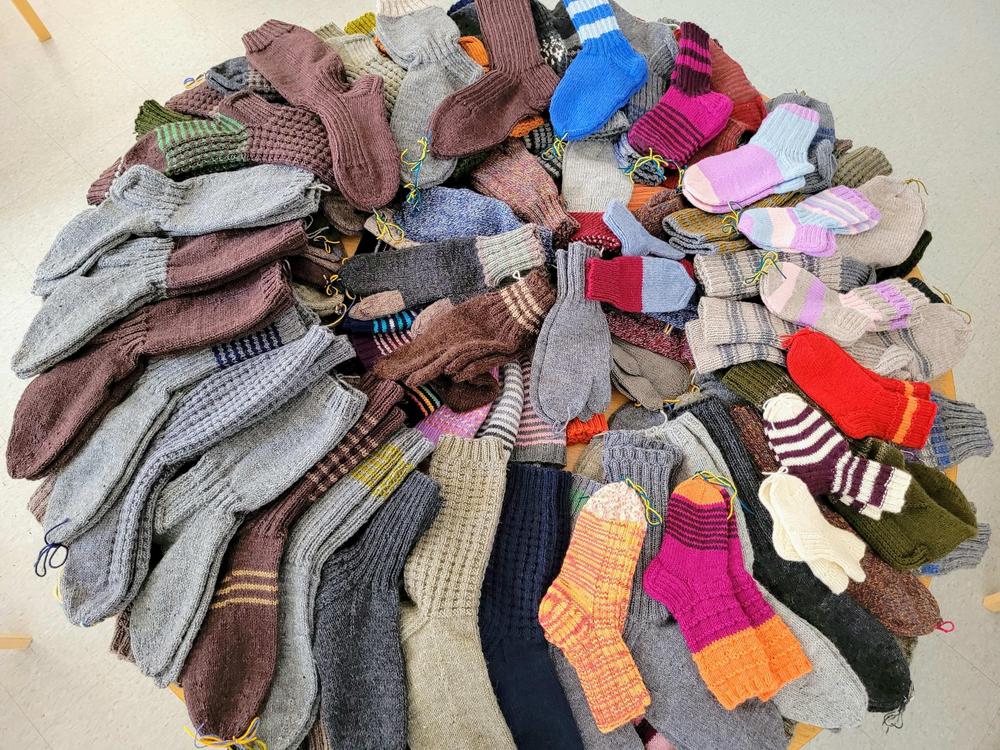118 paria sukkia ja 12 paria liipasinlapasia armeijakäyttöön. Lisäksi 11 neulemyssyä ja monta paria sukkia lasten ja naisten kokoja. Osa lasten sukista oli kuin karamelleja, niin hempeissä väreistä neulottuja ja ihan syötävän suloisen näköisiä.