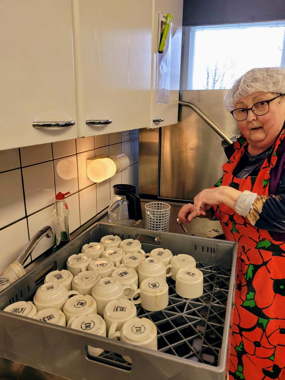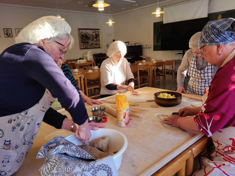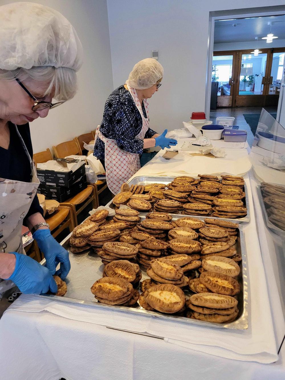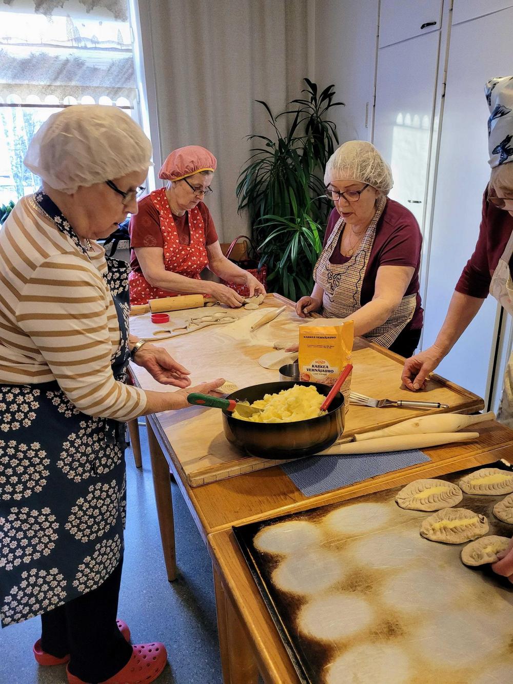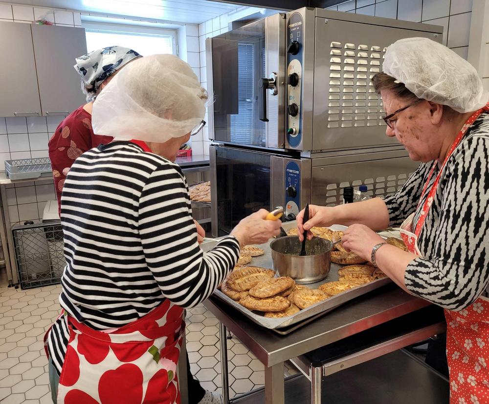 Tekemistä löytyy monenlaista ja välillä käy niin, että joku tekee ihan eri hommaa kuin edellisellä kerralla. Minä olin tänään ensimmäistä kertaa voitelemassa piirakoita ja Kirsti oli paistamassa, kummallekin taisi olla ensimmäinen kerta näissä tehtävissä, ainakin näin suuria määriä käsiteltäessä, onhan se vähän erilaista kuin kotona. Piirakantekijät olivat niin nopeita, että paistopellit eivät juuri ehtineet jäähtyä, kun ne jo vietiin taas pois keittiöstä. Vipinää riitti jokaisessa työpisteessä.