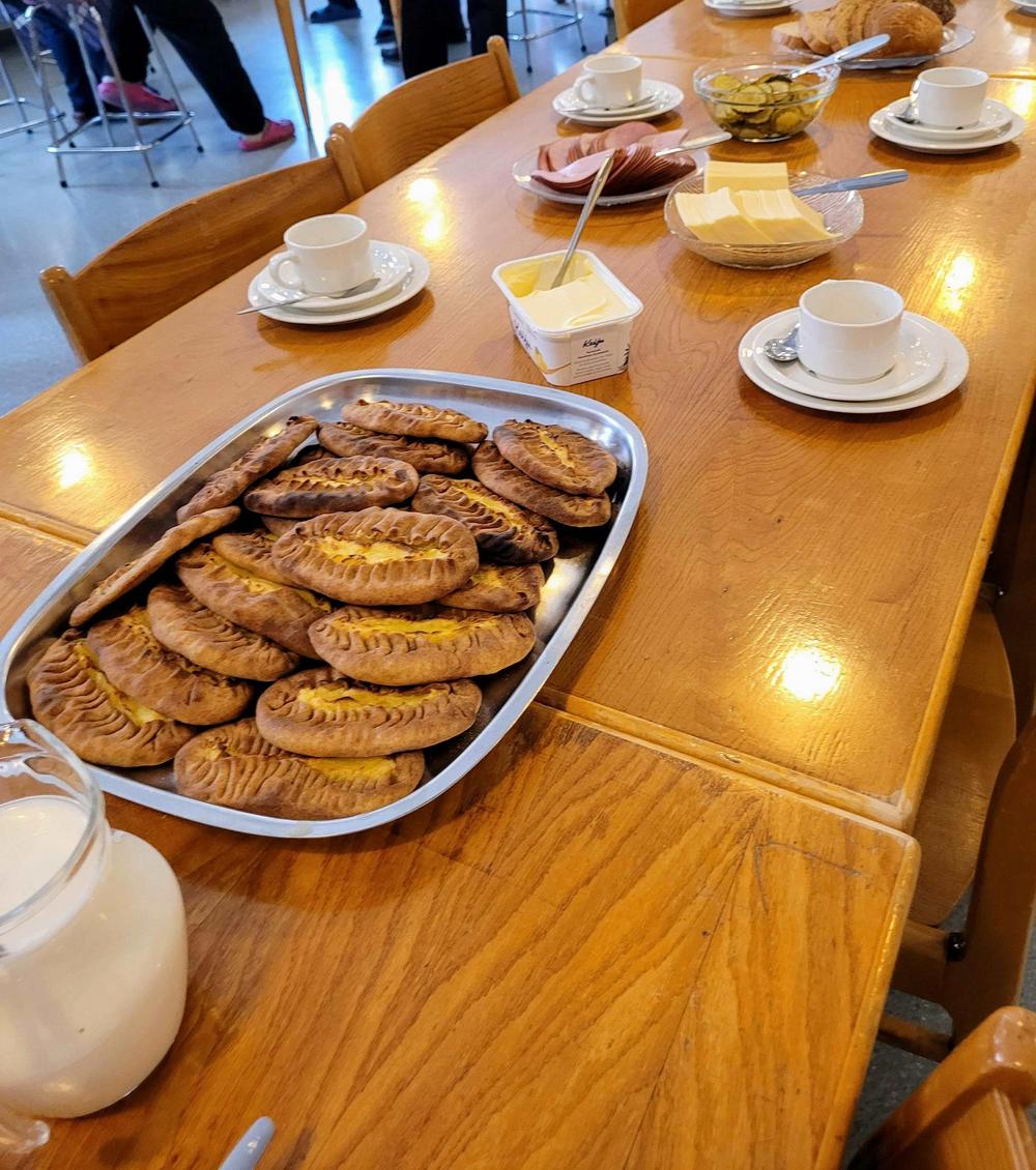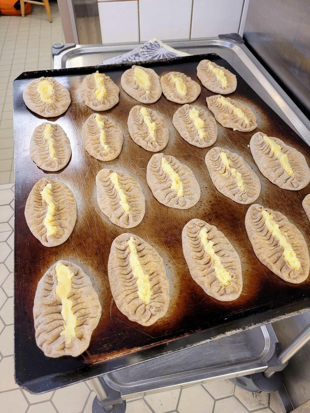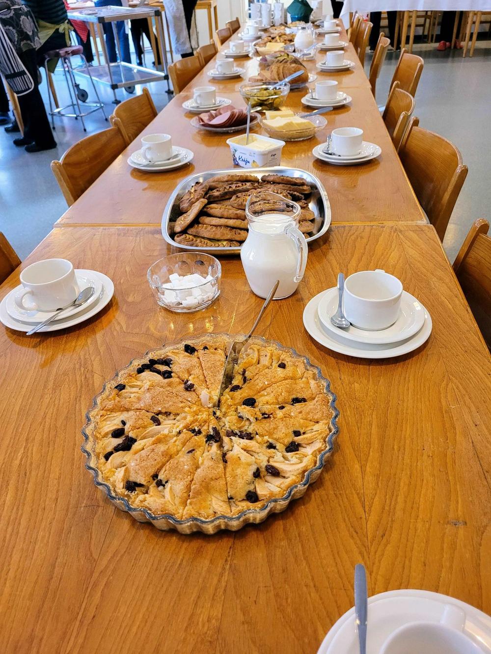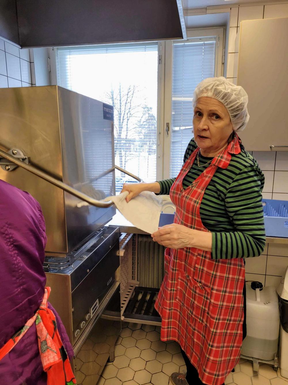 Tekemistä löytyy monenlaista ja välillä käy niin, että joku tekee ihan eri hommaa kuin edellisellä kerralla. Minä olin tänään ensimmäistä kertaa voitelemassa piirakoita ja Kirsti oli paistamassa, kummallekin taisi olla ensimmäinen kerta näissä tehtävissä, ainakin näin suuria määriä käsiteltäessä, onhan se vähän erilaista kuin kotona. Piirakantekijät olivat niin nopeita, että paistopellit eivät juuri ehtineet jäähtyä, kun ne jo vietiin taas pois keittiöstä. Vipinää riitti jokaisessa työpisteessä.