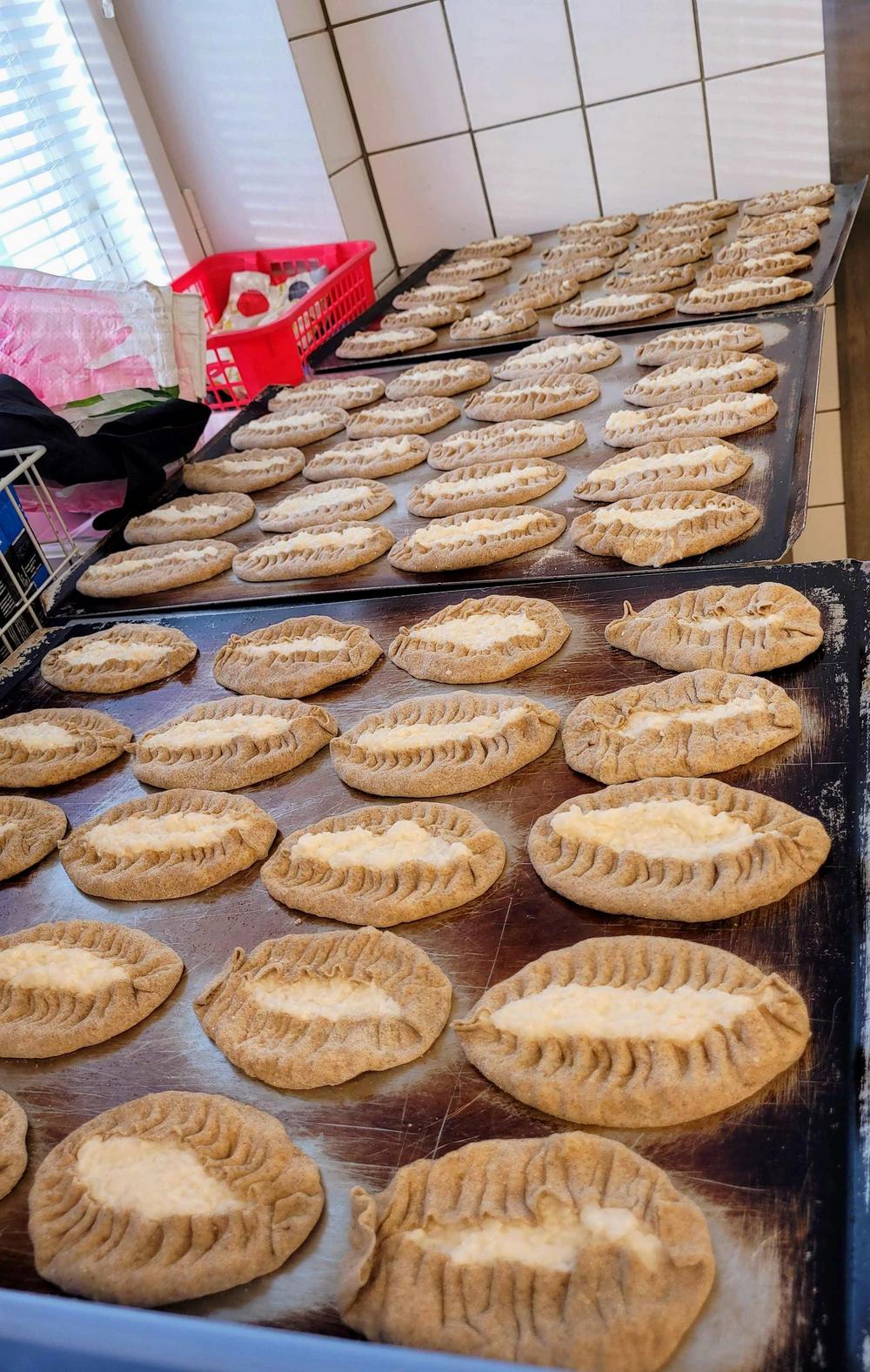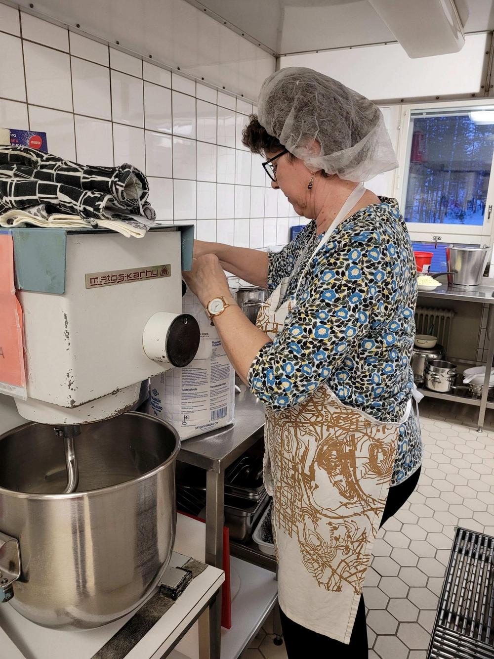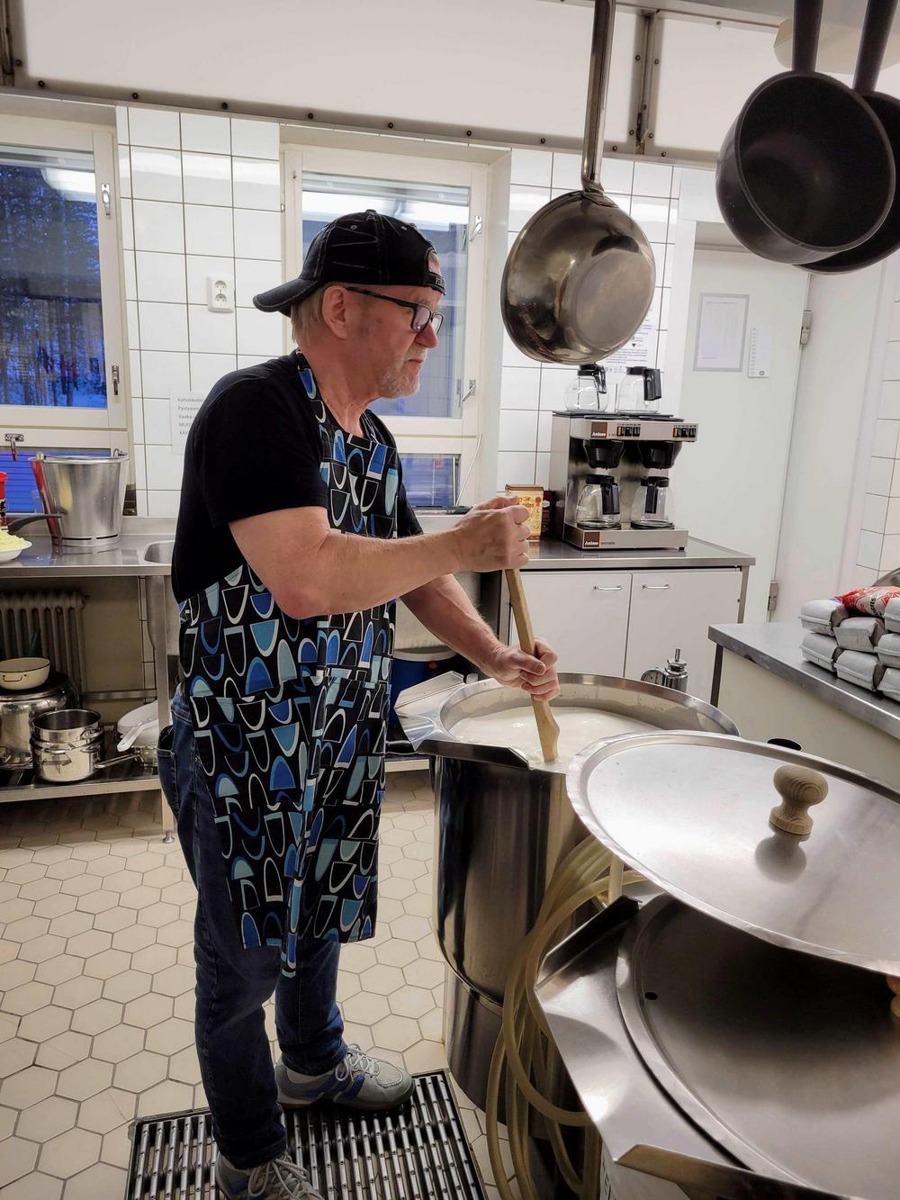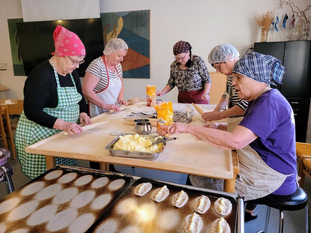 Tekemistä löytyy monenlaista ja välillä käy niin, että joku tekee ihan eri hommaa kuin edellisellä kerralla. Minä olin tänään ensimmäistä kertaa voitelemassa piirakoita ja Kirsti oli paistamassa, kummallekin taisi olla ensimmäinen kerta näissä tehtävissä, ainakin näin suuria määriä käsiteltäessä, onhan se vähän erilaista kuin kotona. Piirakantekijät olivat niin nopeita, että paistopellit eivät juuri ehtineet jäähtyä, kun ne jo vietiin taas pois keittiöstä. Vipinää riitti jokaisessa työpisteessä.