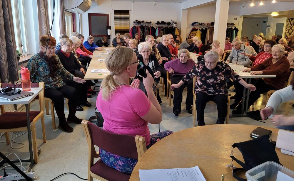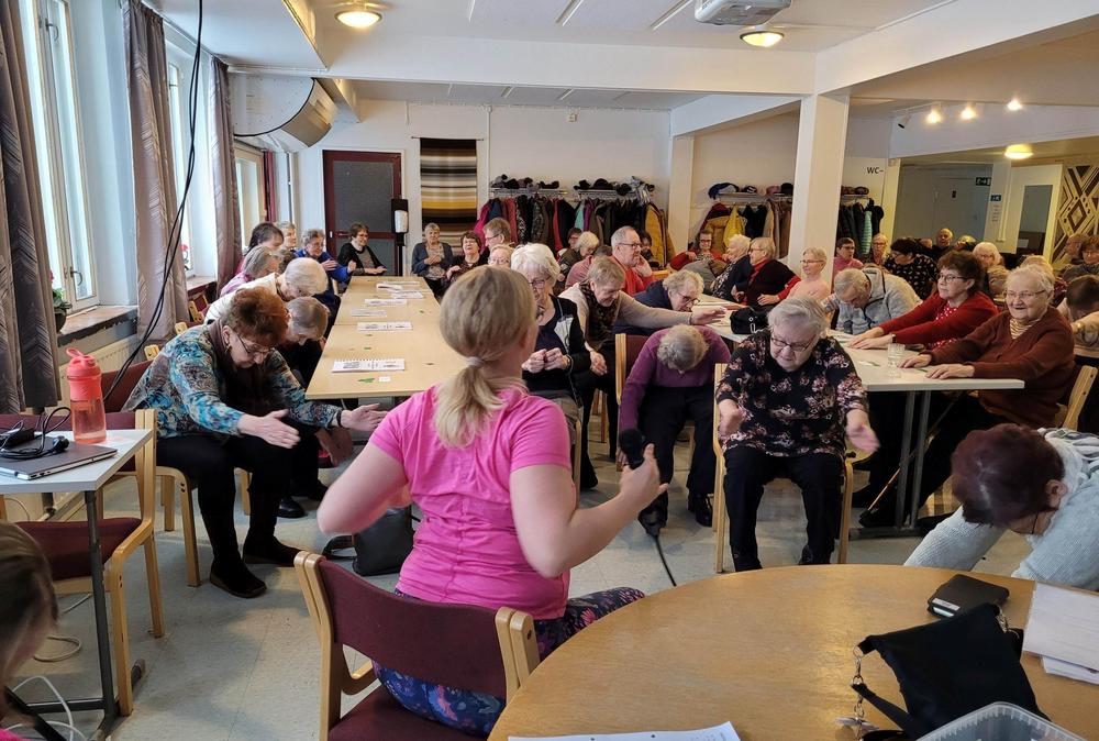 Kerhossa oli tänään ohjelmassa kerhojumppa, sen ohjasi meille Päivi Hamunen ja kyllä siinä kaikille tuli lämmin, vaikka suurin osa jumpasta tehtiin istuen. Samalla saimme tietoa siitä kuinka liikkeet vaikuttavat lihaskuntoon ja tasapainoon. Vaikka meitä oli salin täydeltä, niin yllättävän hyvin mahduimme jumppaamaan, sopu sijaa antaa. Luustoterveyden edistämiseksi tömisteltiin jalkoja voimakkaasti, että tuli tärähtävä liike. Kun tätä liikettä teki yhtä aikaa noin 80 ihmistä, niin siitä lähti aikamoinen ääni.