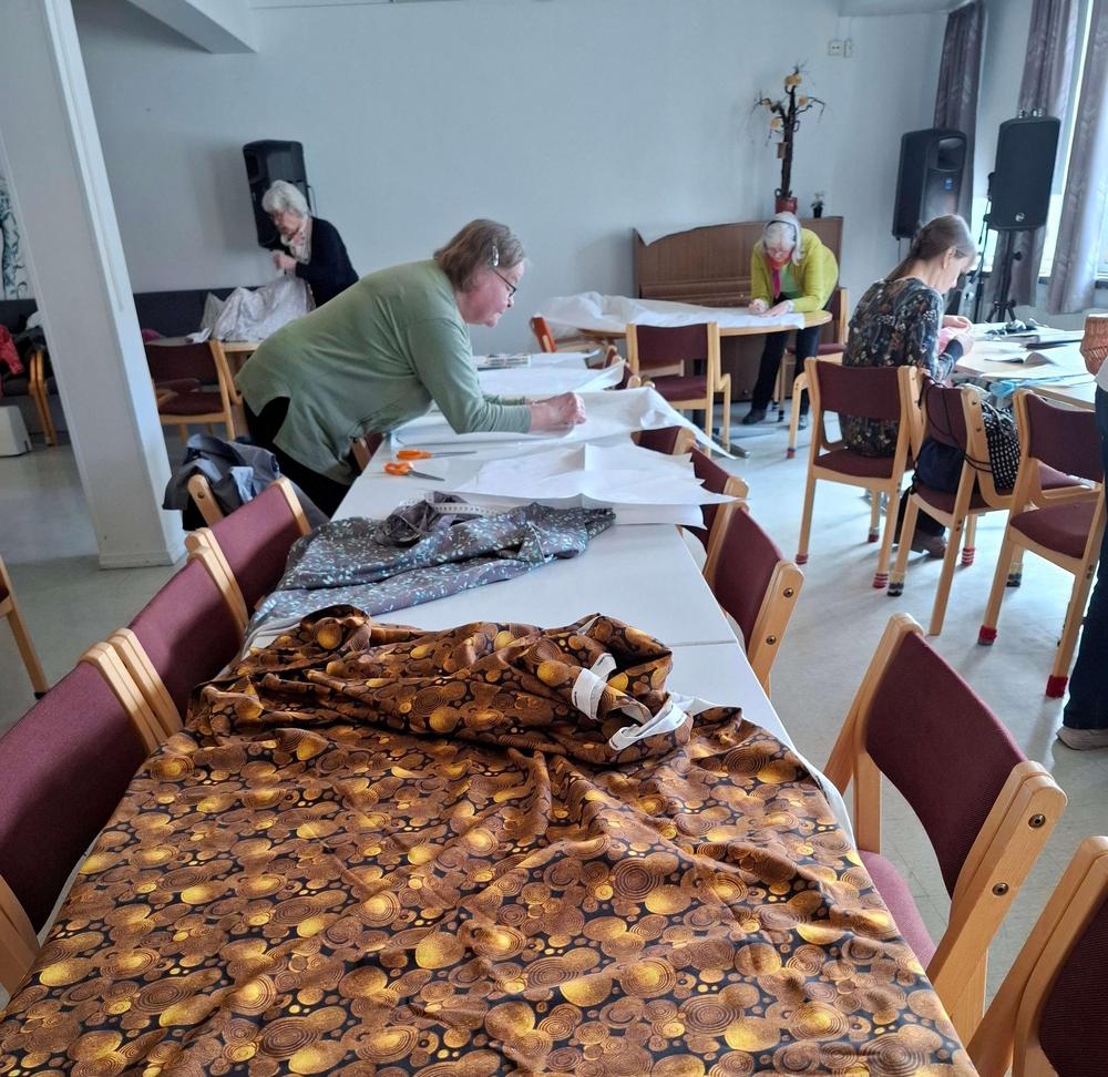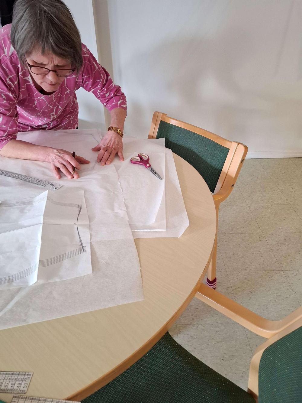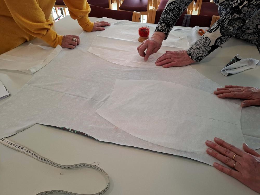 Tämän päivän käsityökerhossa ommeltiin tunika yhdistyksen hankkimilla kaavoilla. Suurin osa ajasta taisi mennä kaavojen piirtämiseen ja kankaan leikkaamiseen, mutta ompelutyöhönkin ehti ainakin osa porukasta.