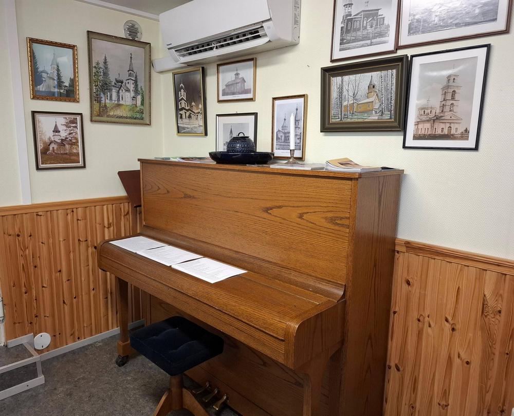 Koska osallistujia oli näin paljon ja tuoleja sekä kirkkosalissa että kahviotilassa on rajallinen määrä, teimme niin, että noin puolet porukasta meni ensin kirkkosaliin ja toinen puoli porukasta meni kahville alakerran kahviotilaan. Rovasti Pertti Ruotsalainen piti lyhyen rukouspalveluksen ja kirkon isännöitsijä Arvo Naumanen esitteli kirkon tiloja ja seurakunnan toimintaa. Kun ohjelma kirkkosalissa oli valmis, niin porukka vaihtoi paikkoja ja näin varmistimme sen, että kaikki mahtuivat istumaan sekä kirkkosalissa että kahviossa.