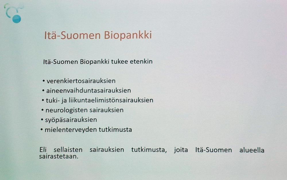 Maanantaina 19.1. meillä vieraili kerhossa tutkimuskoordinaattori Marja-Leena Nuuttila / Itä-Suomen Biopankki. Saimme selkeän ja ymmärrettävän tietopaketin siitä mitä on biopankki. Kiitos vielä kerran Marja-Leena, että kävit kertomassa meille tästä tärkeästä asiasta.