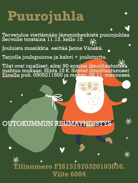Joulukuussa vietetään yhdistyksen puurojuhlaa Servolla torstaina 11.12. klo 15 alkaen. Ovet avataan klo 14:30. Jouluista musiikkia esittää Janne Vänskä. Tarjolla joulupuuroa, kahvia ja joulutorttua.…