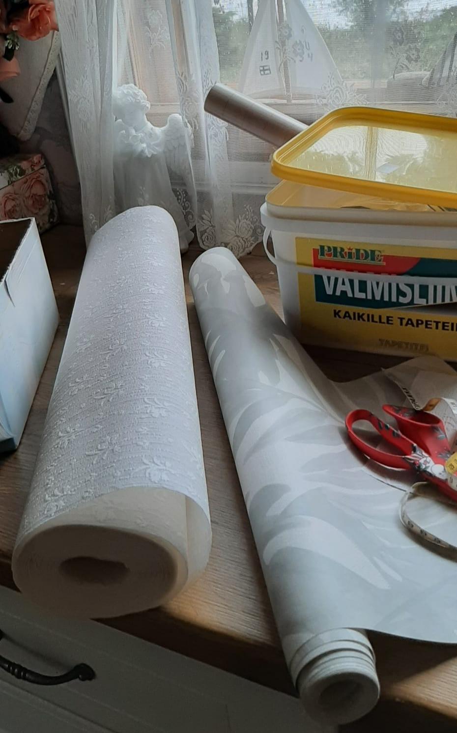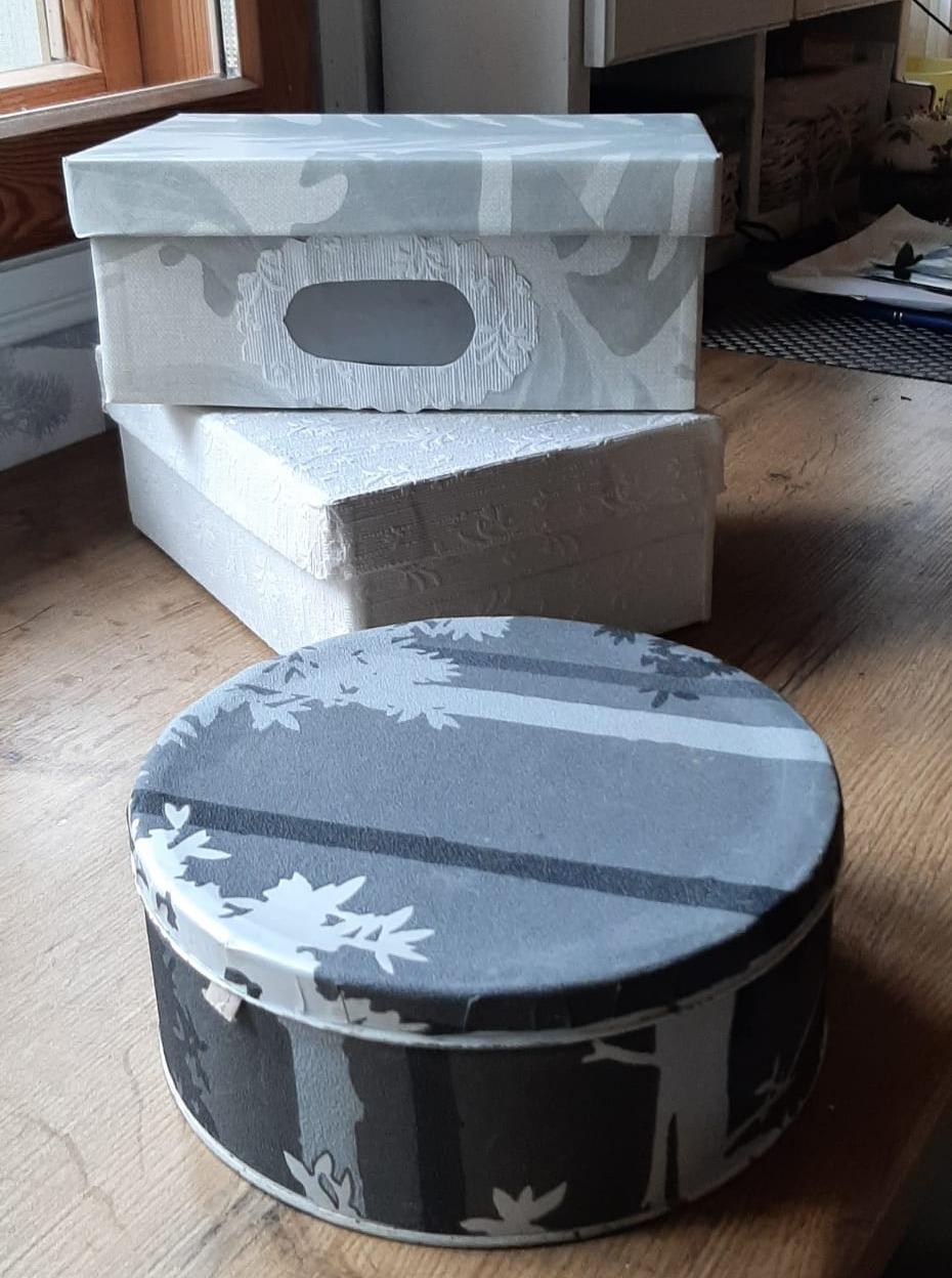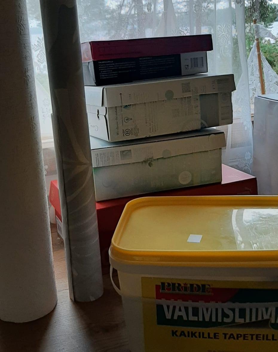 Käsityökerhossa päällystetään laatikoita. Kerhon ohjaajalla on laatikoita ja tapettirullan pohjia, mutta osallistujat voivat myös ottaa omia tarvikkeita kerhoon.