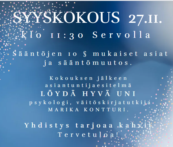 Kerhon alussa SYYSKOKOUS. Käsitellään sääntöjen 10 § mukaiset asiat. Lisäksi käsitellään SÄÄNTÖMUUTOS.